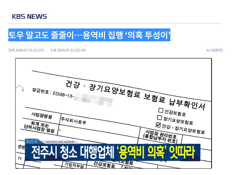 (주)토우처럼 기타항목으로 보험료를 용역비에서 처리한 사례들이 전주시 청소업체 12곳 중 7곳에서 확인되었으며 전체 금액만 5천7백만 원에 달한다는 KBS전주총국의 보도입니다. 이들이 받아간 한 해 급여만 약 10억 원에 이를 것이라고 추정하고 있는데요, 역시 가족들을 임원으로 등록해 급여와 보험료 등을 불법적으로 지급해 온 것이 아닌지 의심스러운 부분입니다.