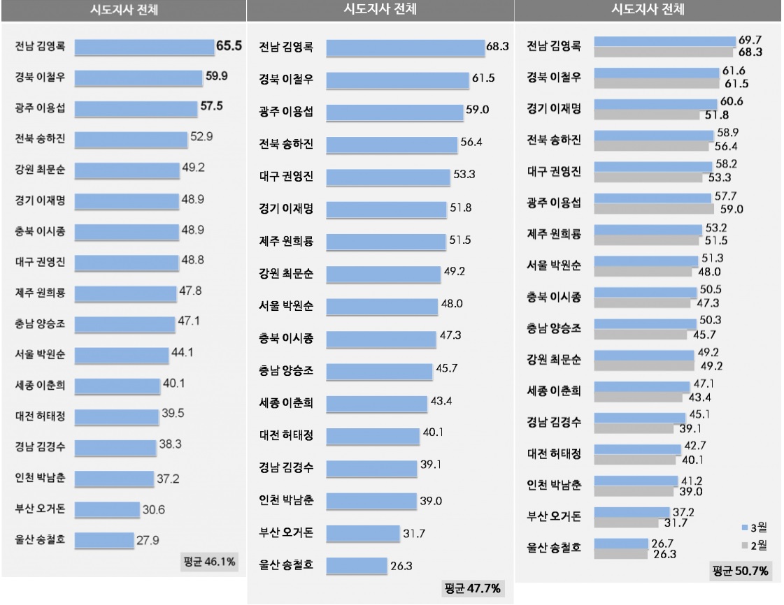 출처: [리얼미터] 2020년 1, 2, 3월 광역자치단체장 평가