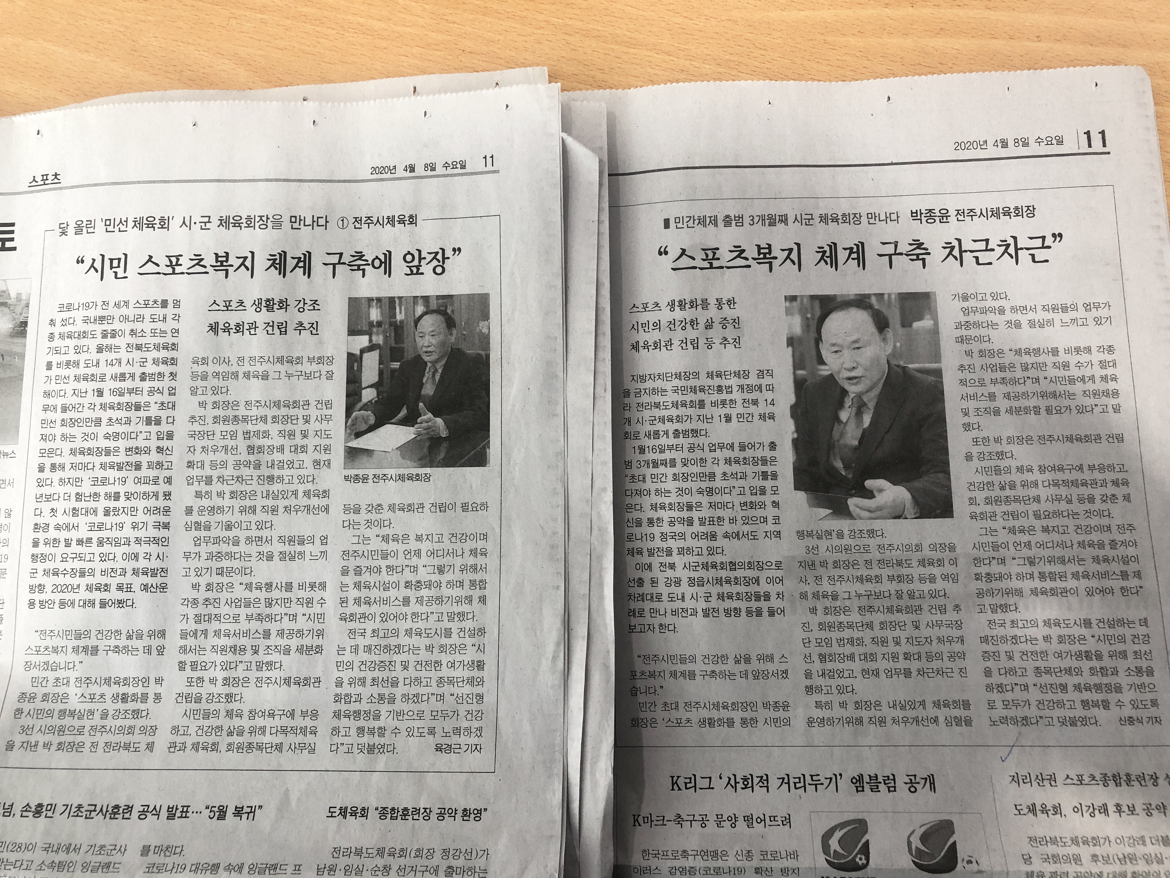 ▲ 4월 8일 수요일 전북일보, 전북도민일보 민선 체육회장 인터뷰 기획 기사 (왼쪽 - 전북일보, 오른쪽 - 전북도민일보)