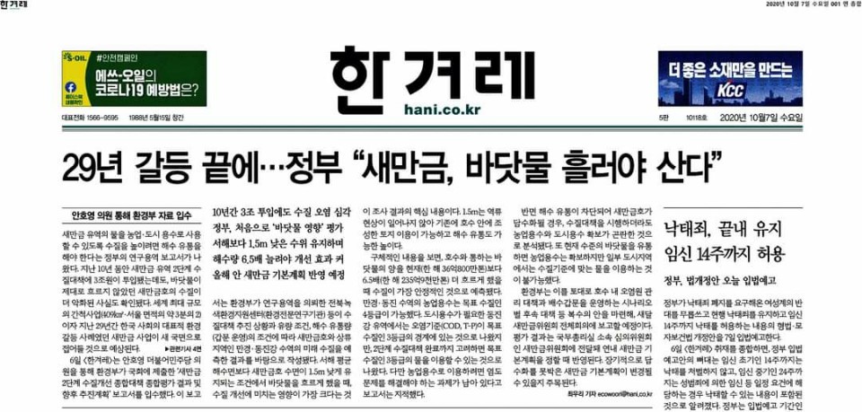 [한겨레] [단독] 29년 갈등 끝에…정부 “새만금, 바닷물 흘러야 산다”(10/7, 최우리)