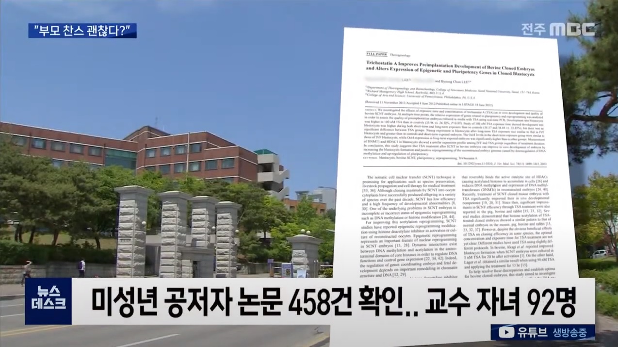 [전주MBC] 논문에 자녀 공저자로 올린 전북대 교수 14명 (2019/9/17, 박연선)