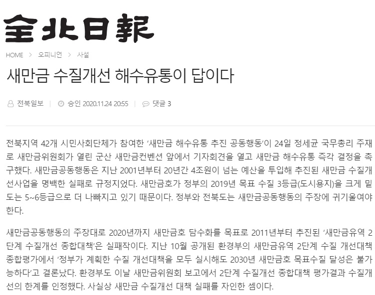 그런데 새만금 해수유통과 관련해 그동안 전북일보에서 보기 어려웠던 주장이 나왔습니다. <새만금 수질개선에 해수유통이 답이다>라는 제목으로 사설을 보도했기 때문입니다.