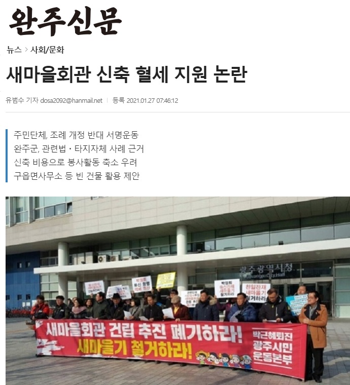 [완주신문] 새마을회관 신축 혈세 지원 논란(1/27, 유범수)