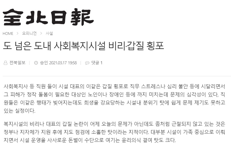 [전북일보] 도 넘은 도내 사회복지시설 비리·갑질 횡포(11면, 사설)