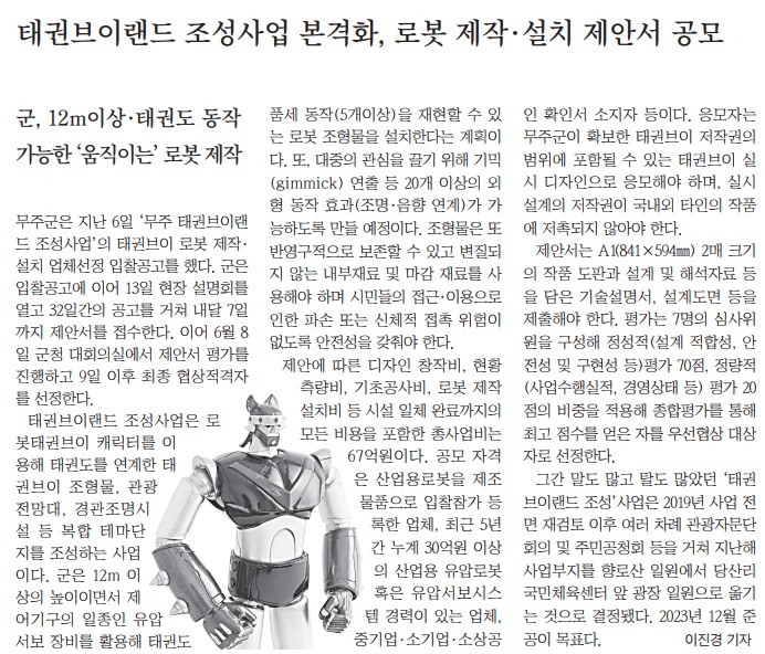 [무주신문] 태권브이랜드 조성사업 본격화, 로봇 제작·설치 제안서 공모(5/17, 이진경)