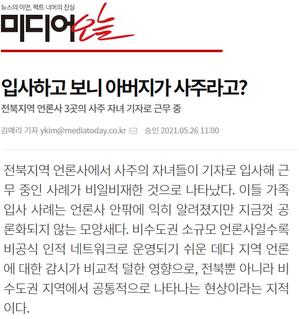 26일 미디어오늘은 “취재를 종합하면 통신사와 종합일간지를 비롯한 전북지역 언론사 3곳에서 사주의 자녀가 해당 언론사에 기자로 입사해 근무 중”이라고 보도했습니다. 구체적인 사례는 다음과 같습니다.