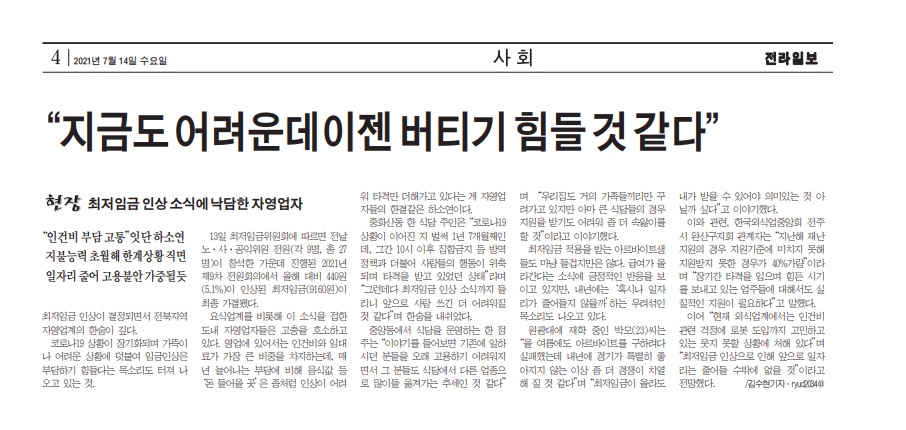 [전라일보] "지금도 어려운데 이젠 버티기 힘들 것 같다" (7/14, 4면 김수현)