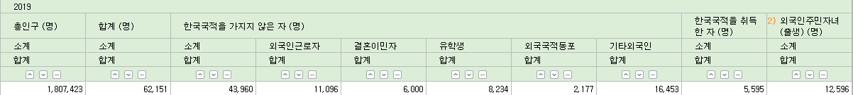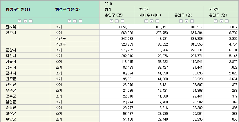 통계청 시도별 외국인주민 현황 조사 결과에 따르면 2019년 기준 전라북도에 거주하는 외국인은 총 62,151명으로 세부 현황은 다음과 같습니다. 이중 전라북도 주민으로 등록된 외국인은 2019년 기준 33,074명입니다.