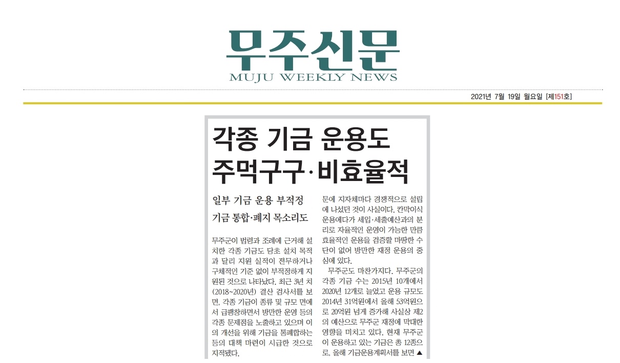 [무주신문] 각종 기금 운용도 주먹구구·비효율적 (7/19, 1면 이진경 기자)