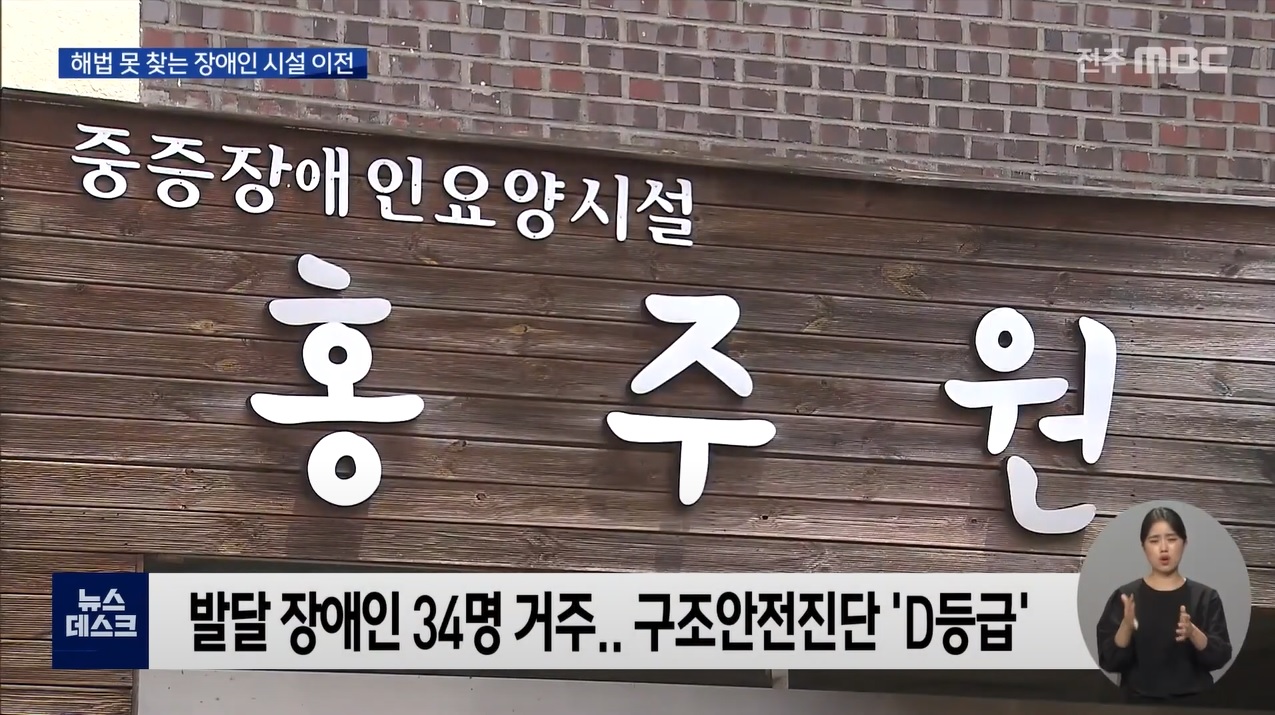 1995년 개원한 홍주원은 현재 34명의 장애인이 거주하고 있습니다. 그런데 5년 전 건물 안전진단 결과 D등급을 받았는데요, 건물 곳곳에 균열이 발생하는 등 계속 거주하기 어려운 상황입니다. 이에 홍주원 측은 보건복지부의 지원 사업을 받아 익산 도치마을의 한 건물을 매입하고 시설을 이전하기로 결정했습니다.