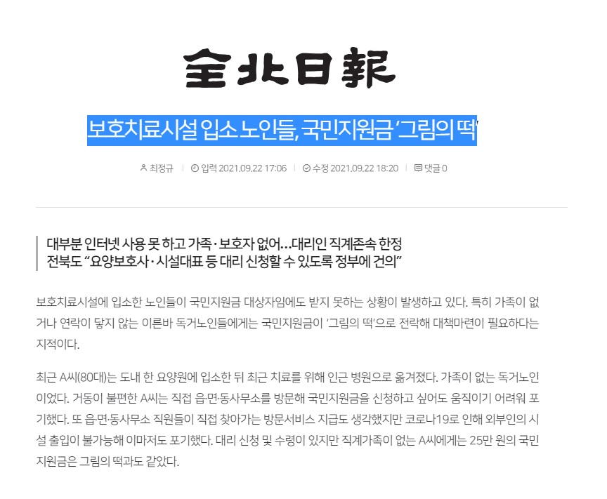 #전북일보, 보호시설 입소 독거노인 위한 대책 마련이 필요 보도