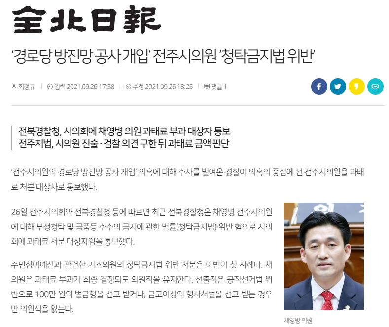 [전북도민일보] 방진망 선공사 논란 전주시의원 ‘김영란법 위반’ 통보(9/27, 권순재)
