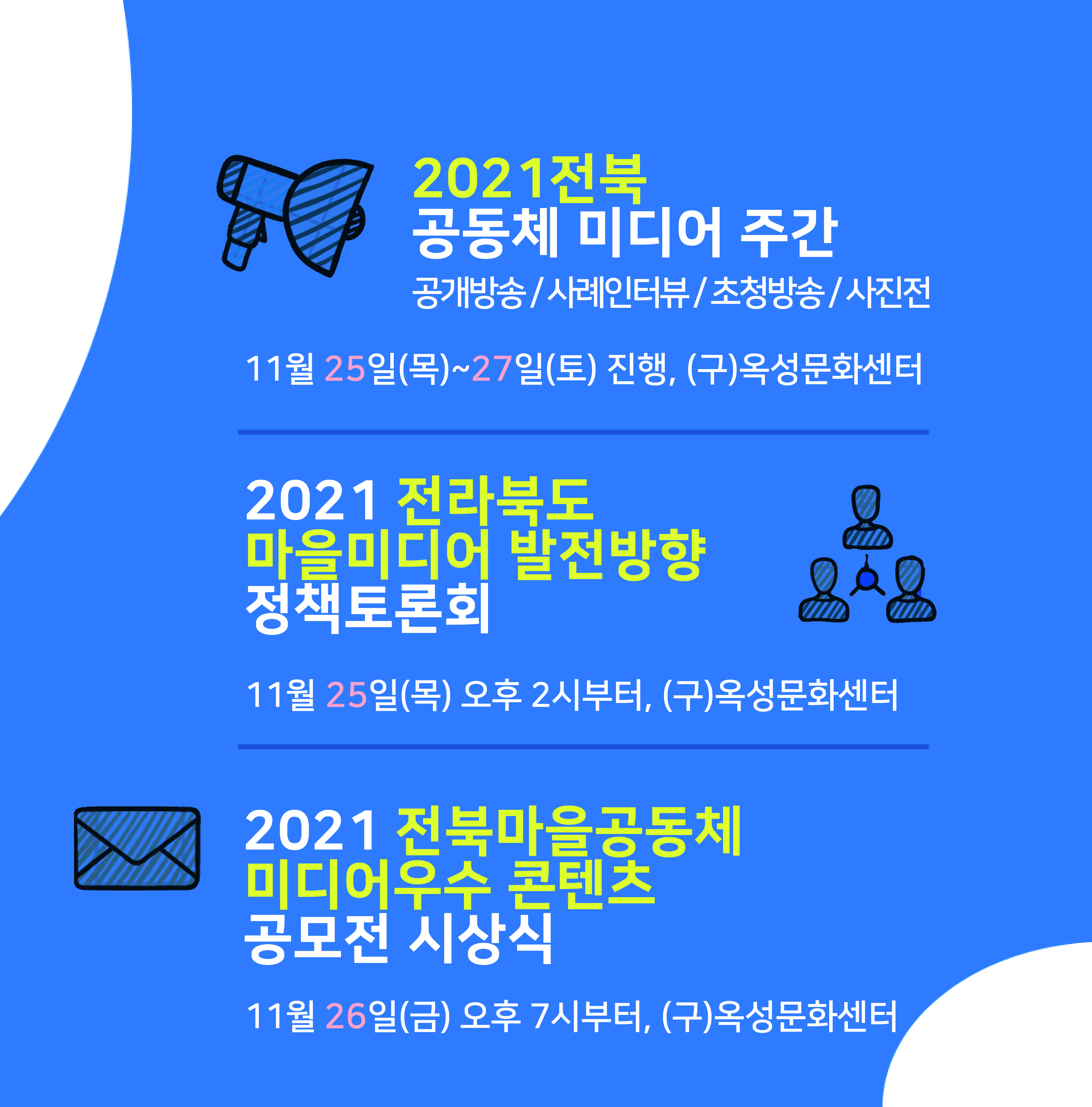 2021 전라북도 마을공동체미디어 발전 방향 정책 토론회 (2021/11/25) (0) | 2021.11.15 |