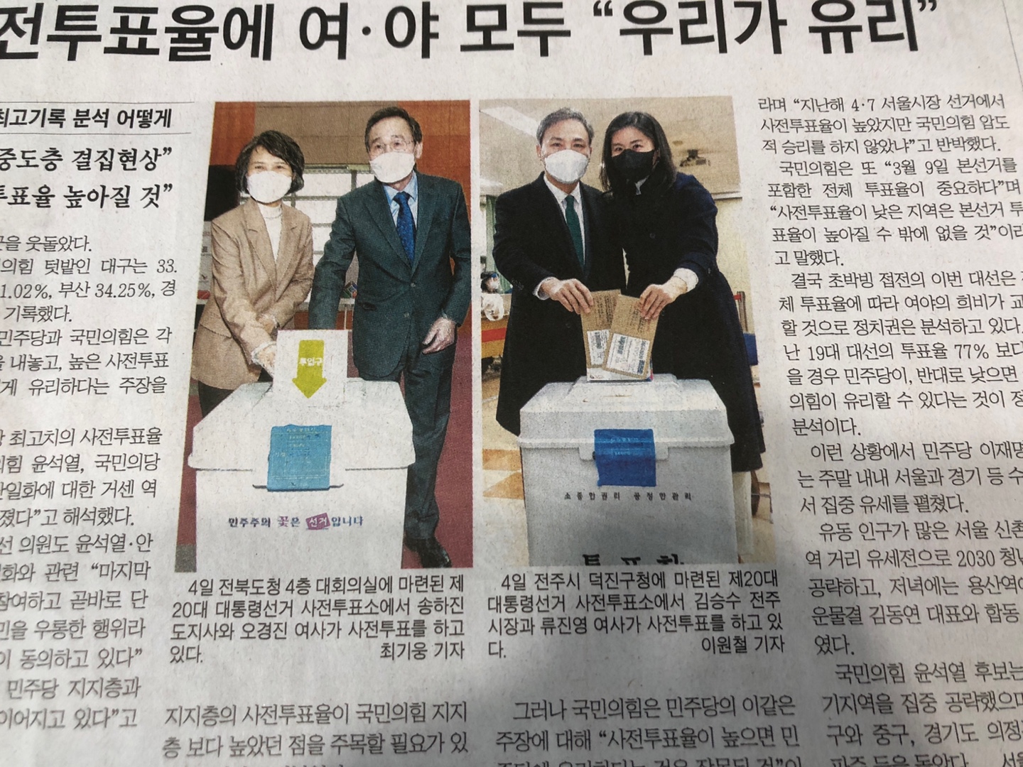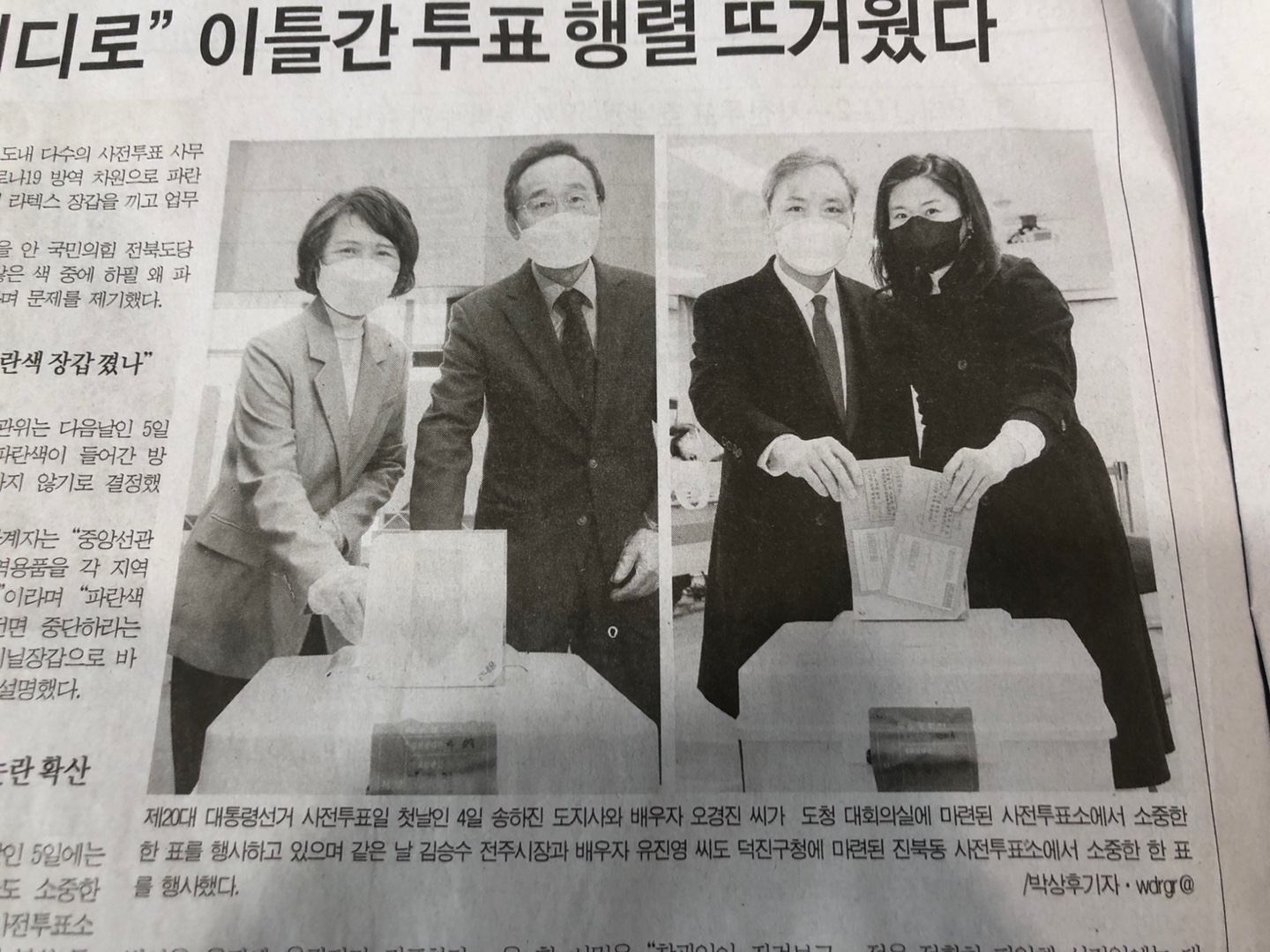 주요 인사들이 사전 투표에 참여하면서 국민들에게 투표를 독려하는 모습은 긍정적으로 볼 수 있습니다. 그러나 많은 선거 출마자들이 유권자들에게 자신의 얼굴을 알리기 위해 노력하고 있는 상황에서, 오늘 자 전북일보의 지면 배치는 자칫 언론이 특정 후보자를 유독 강조하는 것처럼 보일 수 있습니다.