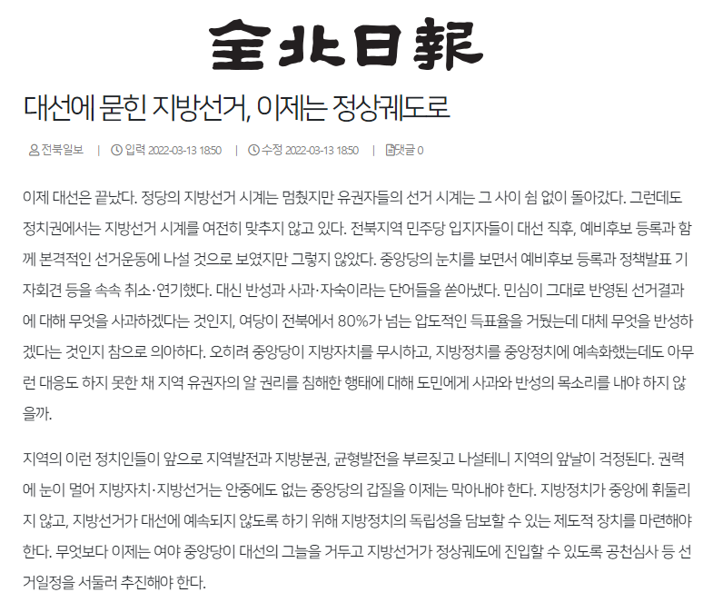 오늘 자 전북일보는 사설을 통해 더불어민주당과 지방선거 입지자들에 대해 다음과 같이 강하게 비판하면서, 지방정치의 독립성 확보를 위한 실질적인 제도 마련이 필요하다고 주장했습니다.