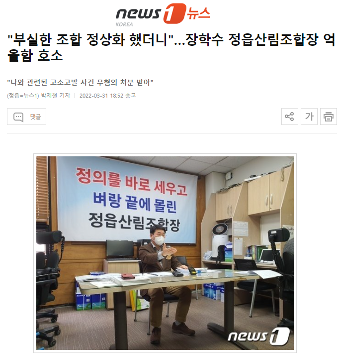 [뉴스1] "부실한 조합 정상화 했더니"…장학수 정읍산림조합장 억울함 호소(3/31, 박제철)
