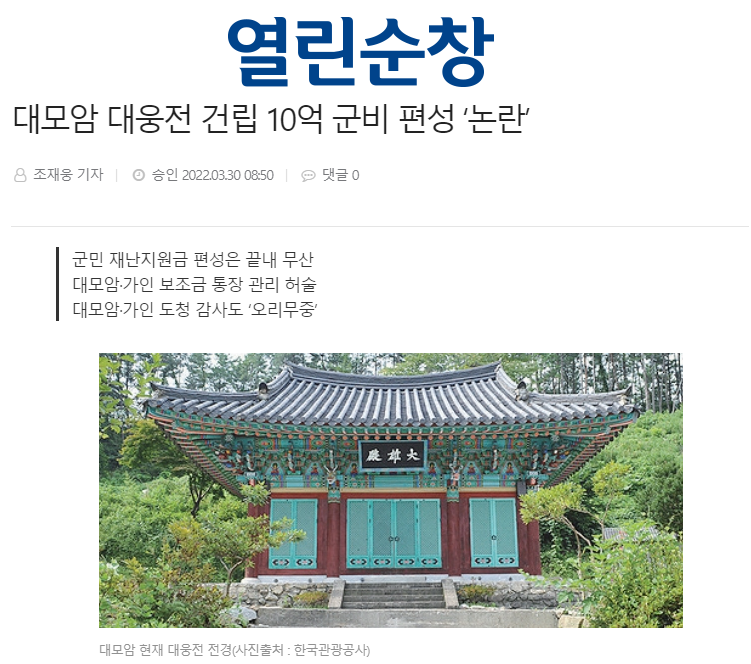 불교 사찰 대모암과 관련해 특혜성 지원 의혹을 받고 있는 순창군. 의혹을 제기한 열린순창은 순창군이 대모암에 대웅전 중건사업 예산 10억 원(군비 100%)을 편성해 논란이라고 보도했습니다.