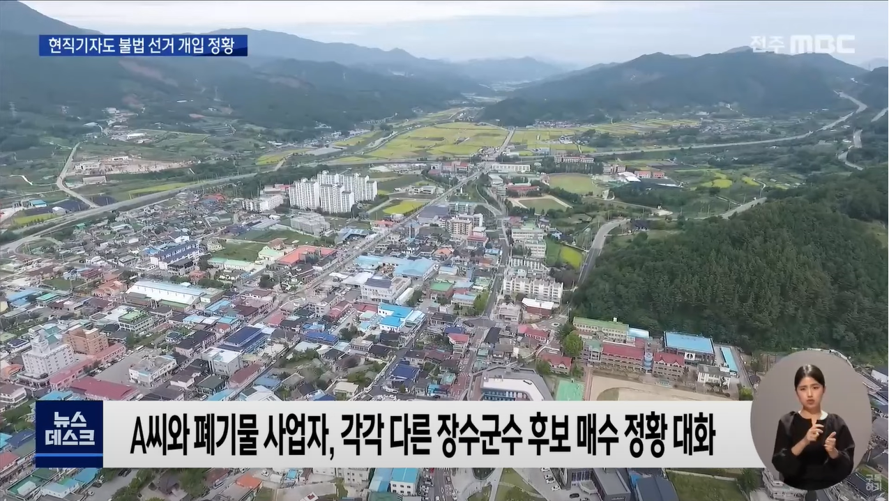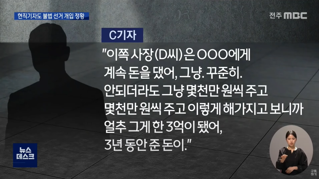 | 작년 10월 하순 도내 언론사 정치담당 C 기자가 지인과 나눈 대화. 폐기물 사업을 원했던 사장 D 씨가 유력 장수군수 후보에게 거액을 줬다는 얘기가 등장합니다. [C기자 대화] "이쪽 사장(D 씨)은 ***에게 계속 돈을 댔어, 그냥. 꾸준히. 안되더라도 그냥 몇천만 원씩 주고 몇천만 원씩 주고 이렇게 해가지고 보니까 얼추 그게 한 3억이 됐어, 3년 동안 준 돈이." 그리고 그 사이 이중선 예비후보에게 처음 접근했던 A 씨가 또 다른 장수군수 후보에게 접근해 수천만 원을 건넸다는 말도 담겨 있습니다. C 기자는 이 같은 작업을 통해 선거 이후 폐기물 처리장 허가만 나면 업체로부터 A 씨와 자신이 보상을 약속받았다는 말도 합니다. - 전주MBC <선거조직‧자금 미끼로 인사권‧인허가권 요구> 기사 중 |