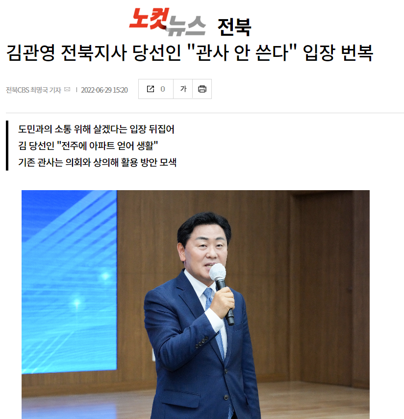 이런 분위기 속에서도 김관영 도지사 당선인은 당선 후 도민과의 소통을 위해 관사를 사용하겠다는 입장을 밝힌 적이 있습니다. 그러나 29일 관사를 사용하지 않겠다고 입장을 번복했는데요, 현재는 군산에 거주하고 있지만 전주에 작은 아파트를 얻어 거주할 생각이라고 밝혔습니다.