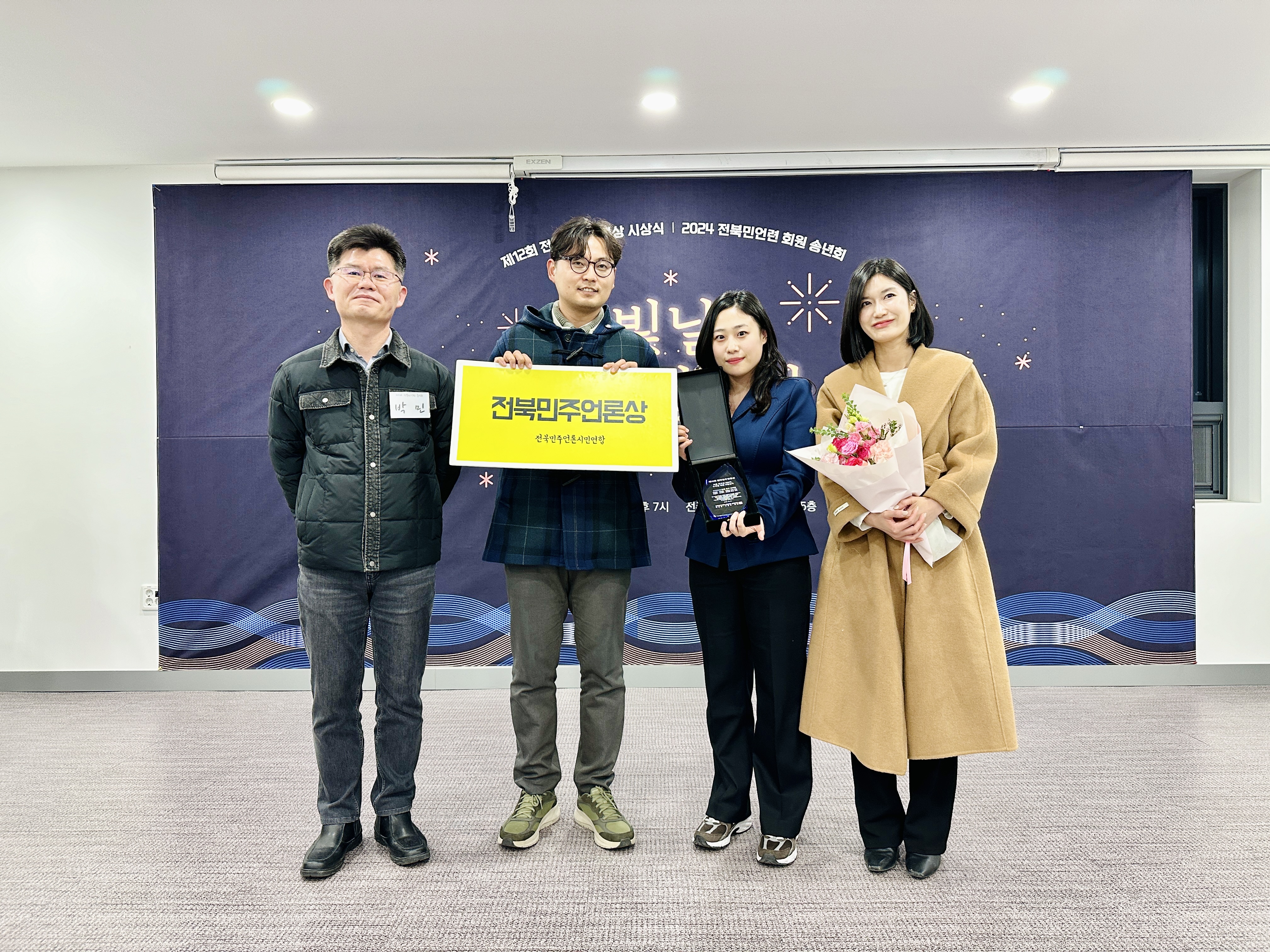 먼저 『제12회 전북민주언론상』 <드론 축구와 200억, 누구를 위한 사업인가> 전주MBC 드론 축구 취재팀 시상이 진행되었습니다. 이번 전주MBC 드론축구 취재팀의 보도는 지역사회에서 드러나지 않던 문제의 실체를 드러내고 해결의 실마리를 제공한 보도라는 점, 지역 언론의 질적 향상과 지역주민의 알 권리 충족에 기여한 유의미한 보도였다는 평입니다. 이날 시상식에는 정자형, 박혜진, 허현호 기자가 참여해 자리를 빛내주었습니다.