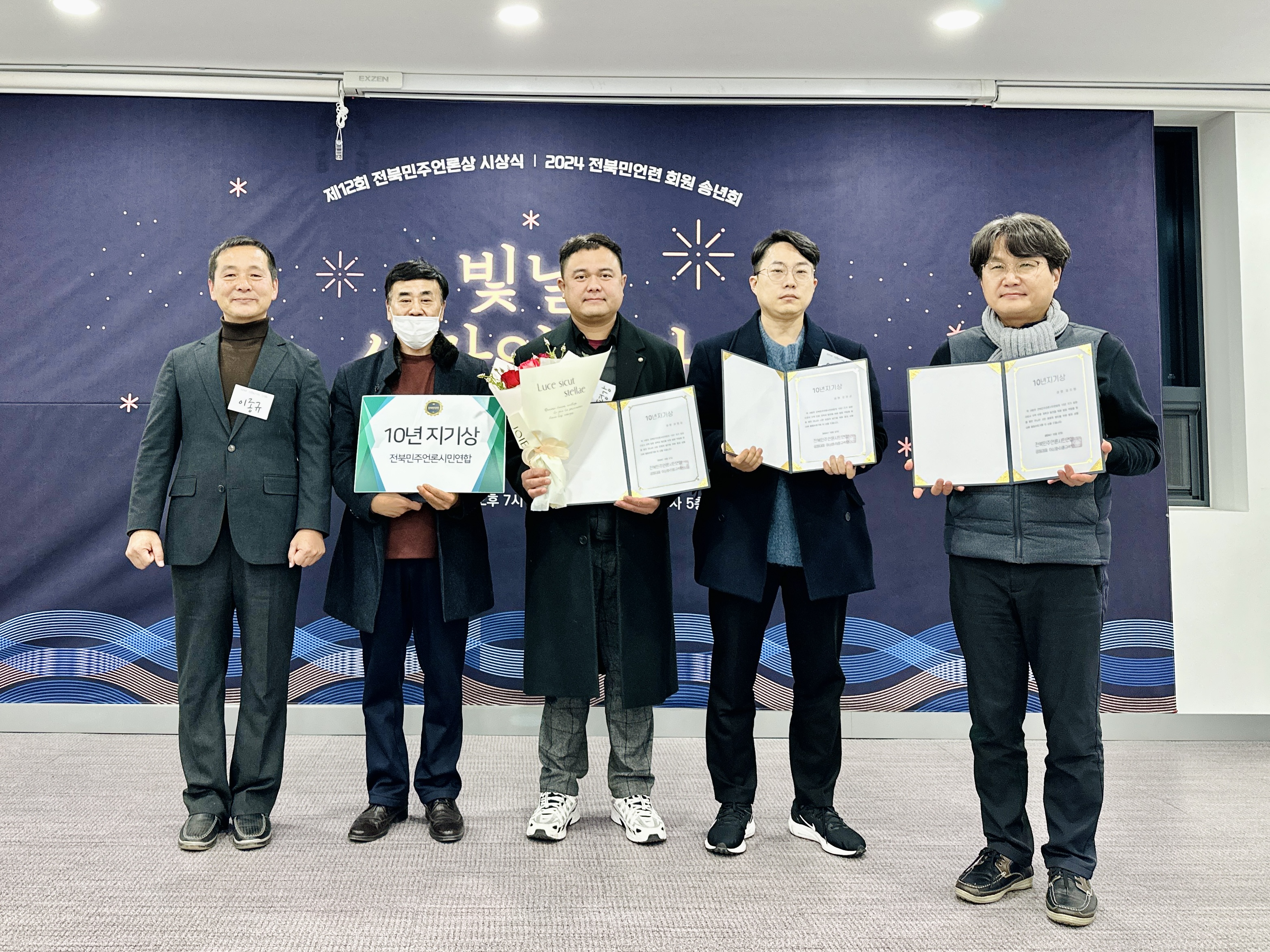 올해는 <10년지기상>을 준비했습니다. 2024년 전북민언련 20년차 회원이 되신 분은 모두 17명이고, 10년차 회원은 49명이나 계셨는데요. 이날 현장에 오신 김진원, 정치형, 이평강, 오청균 회원님이 10년지기 상을 대표 수상 하셨습니다. 감사드립니다.