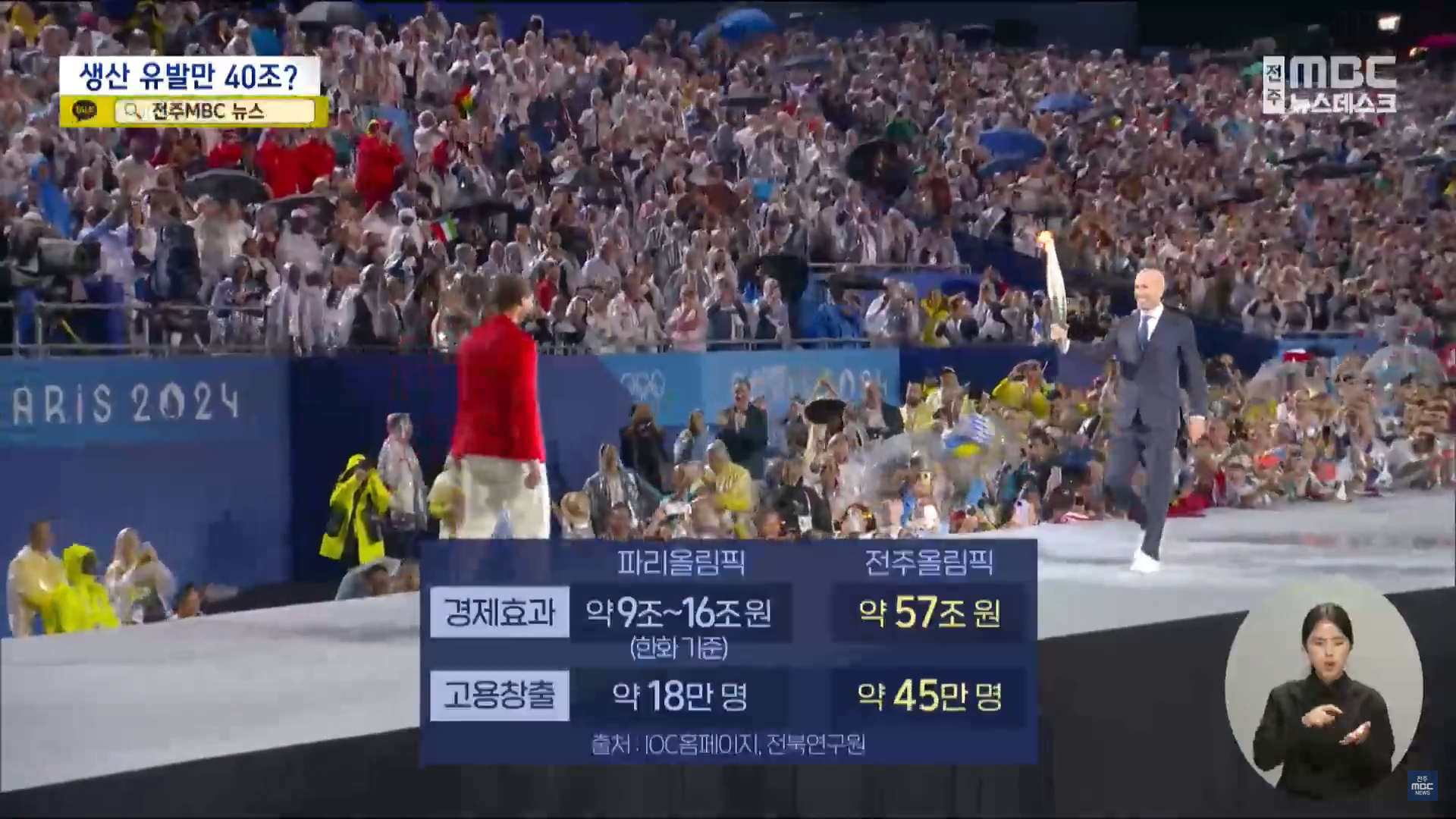 전주MBC가 국제올림픽위원회(IOC) 홈페이지와 전북연구원에 공개된 자료를 바탕으로 보도한 2024 파리 올림픽의 경제 효과는 약 9조 원에서 16조 원, 고용창출 효과는 약 18만 명 정도입니다.