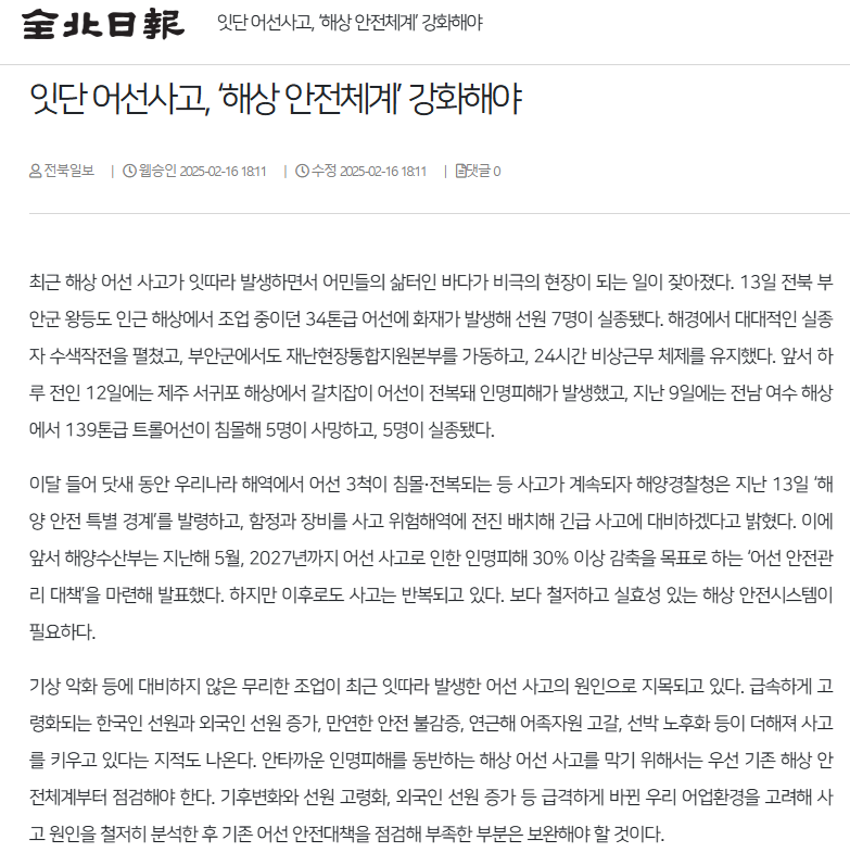 [전북일보] 잇단 어선사고, ‘해상 안전체계’ 강화해야(2/17, 15면, 사설)