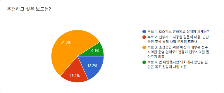 네 개의 후보 중 전주MBC <소상공인 위한 예산이 대부분 전주시의원 운영 업체로? 전윤미 전주시의원 몰아주기 의혹> 보도가 54.5%의 투표를 받아 2025년 7월의 좋은 기사로 선정되었습니다. 축하드립니다.