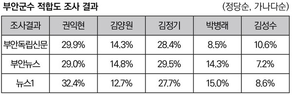 이후 비슷한 시기 부안뉴스, 뉴스1 전북취재본부의 여론조사도 진행됐는데요. 부안뉴스 여론조사에서는 김정기 전북도의원 29.5%, 권익현 부안군수 29.0%, 김양원 전 전주 부시장 14.8%, 박병래 부안군의회 의장 14.3%, 김성수 전 부안군의회 의장 7.2%, 기타 1.8%, 없음 1.1%, 잘모름 2.4%로 나타났습니다.
