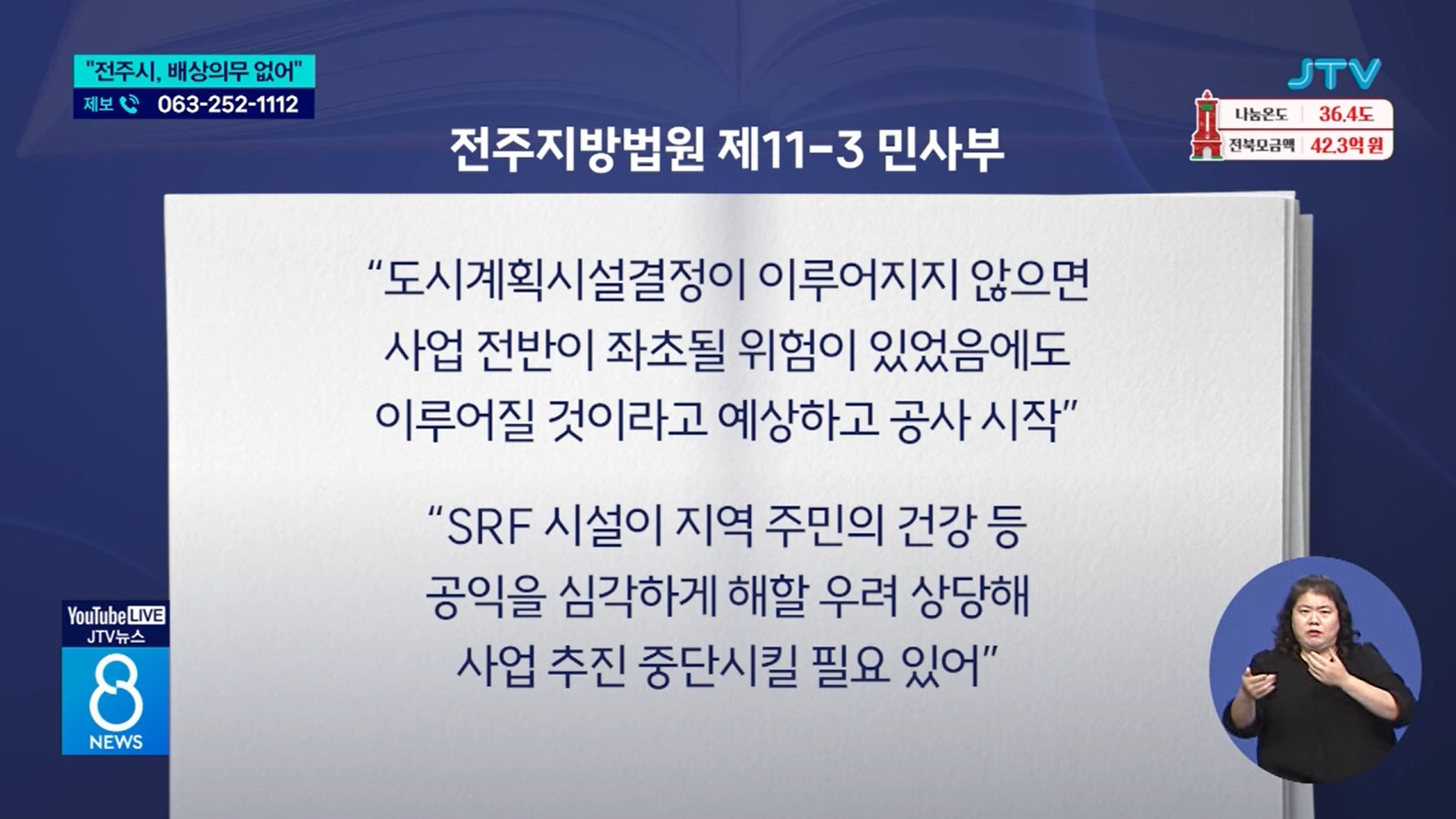 고형연료(SRF) 소각‧발전 시설 건립을 추진하던 팔복동 산업단지에 있는 민간업체(주원전주)가 전주시를 상대로 낸 손해배상 청구 소송에서 전주시가 승소했습니다. 앞서 업체 측이 건축 허가 취소 및 건축물 철거명령 취소 등 행정소송에서는 대부분 승소했지만 손해배상은 인정되지 않았는데요. 법적 다툼은 끝나지 않아 우려는 남아 있습니다.