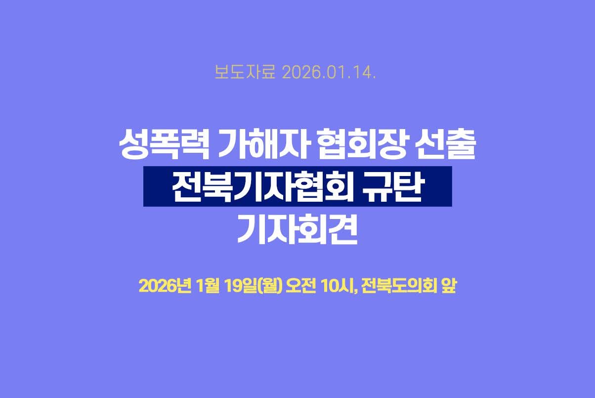과거(기자 되기 전) 성폭력 가해 사건으로 2018년 미투가 발생했고 그 일을 무마하려 2차 가해까지 발생시켜 사회적 지탄을 받았던 인물이 300여 명의 기자를 대표하는 제50대 전북기자협회장으로 당선된 이번 사태에 참담함을 느낍니다. 이에 시민사회단체들은 지난 7일 공동성명을 내고 협회장 사퇴 및 협회의 자성을 촉구했으나, 협회장은 14일 ‘지금 다시 같은 사안이 거론되고 있는 상황에 대해 유감스럽게 생각한다’는 입장만을 밝혔을 뿐입니다. 또한 자신의 거취에 대한 책임도 회피하고 있음을 확인할 수 있었습니다. 이에 <성폭력 가해자 협회장 선출 전북기자협회 규탄 기자회견>을 2026년 1월 19일(월), 오전 10시 전북도의회 앞에서 진행합니다.