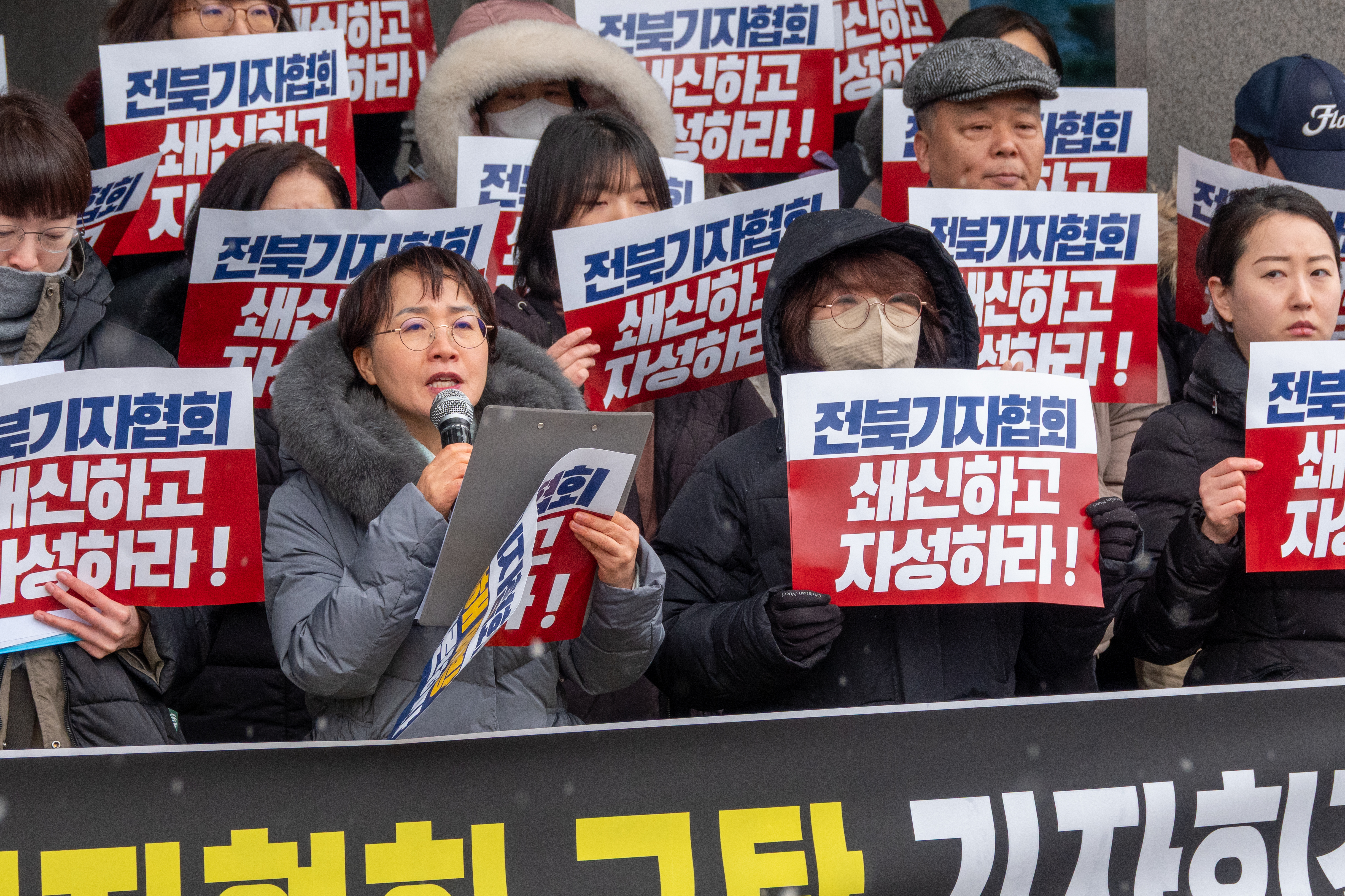 오늘 우리는 참담한 심정으로 이 자리에 섰습니다. 권력을 감시하고 사회의 도덕적 파수꾼이 되어야 할 언론인들의 기구인 전북기자협회가 성폭력 가해 당사자를 수장으로 선출하는 윤리적 불감증을 드러냈기 때문입니다.