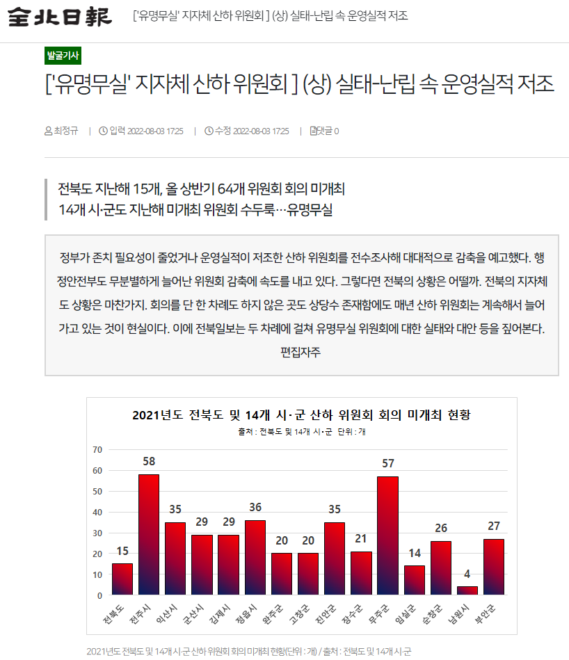 전북일보는 전라북도와 14개 시‧군 산하 위원회의 회의 개최 횟수를 분석하면서 회의를 하지 않은 위원회가 상당함에도 오히려 위원회 개수는 점점 늘어나고 있다고 지적했습니다. 기자는 가장 큰 문제로 필요성이 적거나 역할이 비슷한 위원회를 정리하려고 해도 대부분 법령과 조례에 근거해 정리가 쉽지 않다는 점을 지적한 후 조례 정비가 우선 필요하다는 점을 강조했습니다.