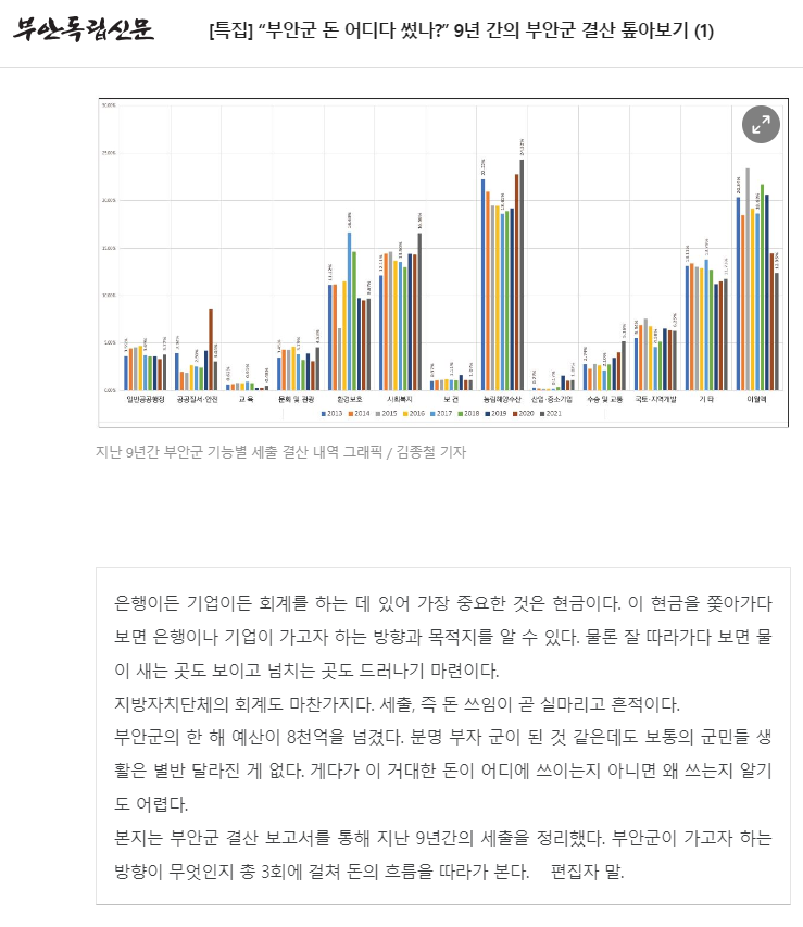 지역 일간지나 방송사가 각 시‧군별로 세세한 예산을 분석하기에는 한계가 있는데요, 부안독립신문의 이번 기획 보도는 지역의 풀뿌리 신문만이 할 수 있는 역할을 잘 보여줬다고 생각하기에 이달의 좋은 기사 후보로 추천합니다.