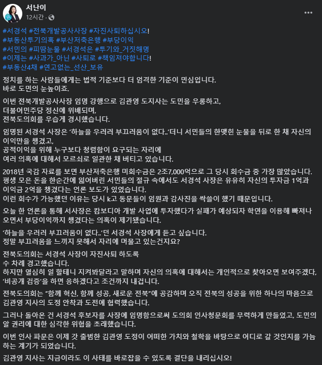 서난이 전북도의원 페이스북 글 편집