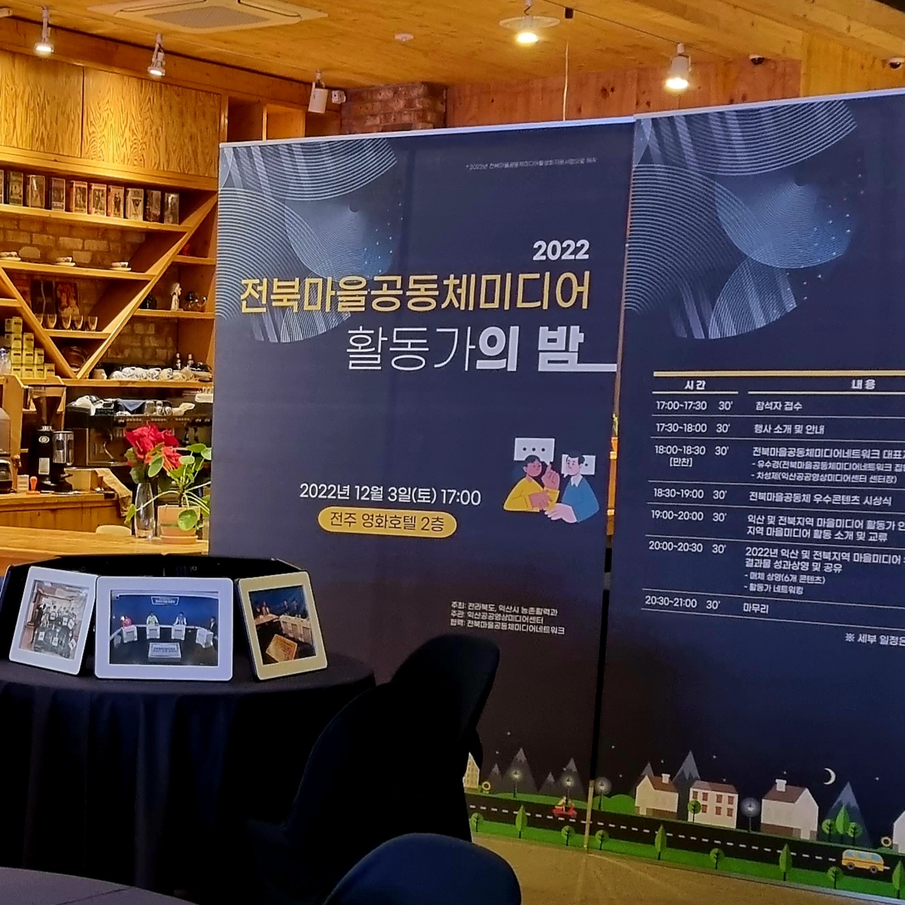 2022년 12월 3일 영화호텔 2층에서 진행된 전북마을공동체미디어 활동가의 밤은 많은 분들의 참여 속에 우수콘텐츠 시상식 및 참여 단체 소개 그리고 맛있는 식사를 진행하며 잘 마무리 되었습니다.