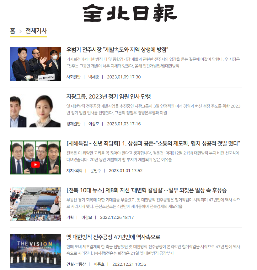 2023-01-11(수) | “대한방직 옛 부지 올바르게 개발해야” 전북도의회 주관 정책 세미나 진행 | 남형진 기자 | 홈페이지에는 기사가 검색되나, 12일 지면에서는 찹아볼 수 없음 | |