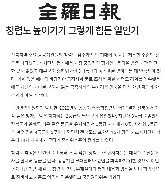 지난 26일 국민권익위원회가 2022년도 공공기관 종합청렴도 결과 보고서를 발표했습니다. 그런데 전라북도의 경우 1등급을 받은 지방자치단체와 공공기관이 한 곳도 없는 것으로 나타났고, 대부분 하위권으로 나타났다는 지역 언론들의 보도가 이어졌습니다. 일부 지역 일간지들은 사설을 통해 각 기관들의 자성과 노력을 촉구했습니다.