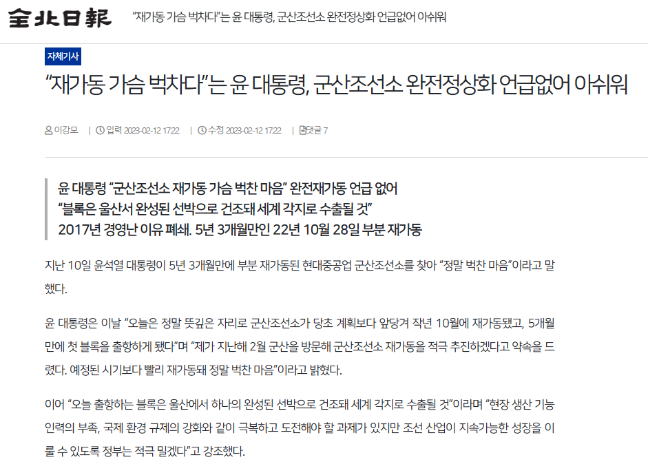 [전북일보] 윤 대통령, 군산조선소 완전정상화 언급 없어 ‘아쉬움’(2면, 이강모)