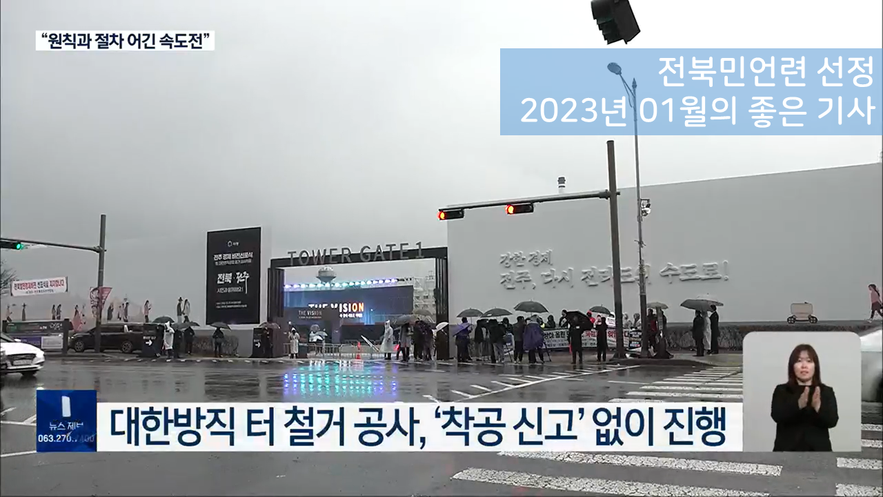 2023년 01월의 좋은 기사는 네 개의 후보 중 <착공 신고 없었던 (주)자광의 대한방직 부지 폐공장 철거 공사, 절차 무시 지적> KBS전주총국 보도가 44%의 투표를 받아 2023년 01월의 좋은 기사로 선정되었습니다. 축하드립니다.