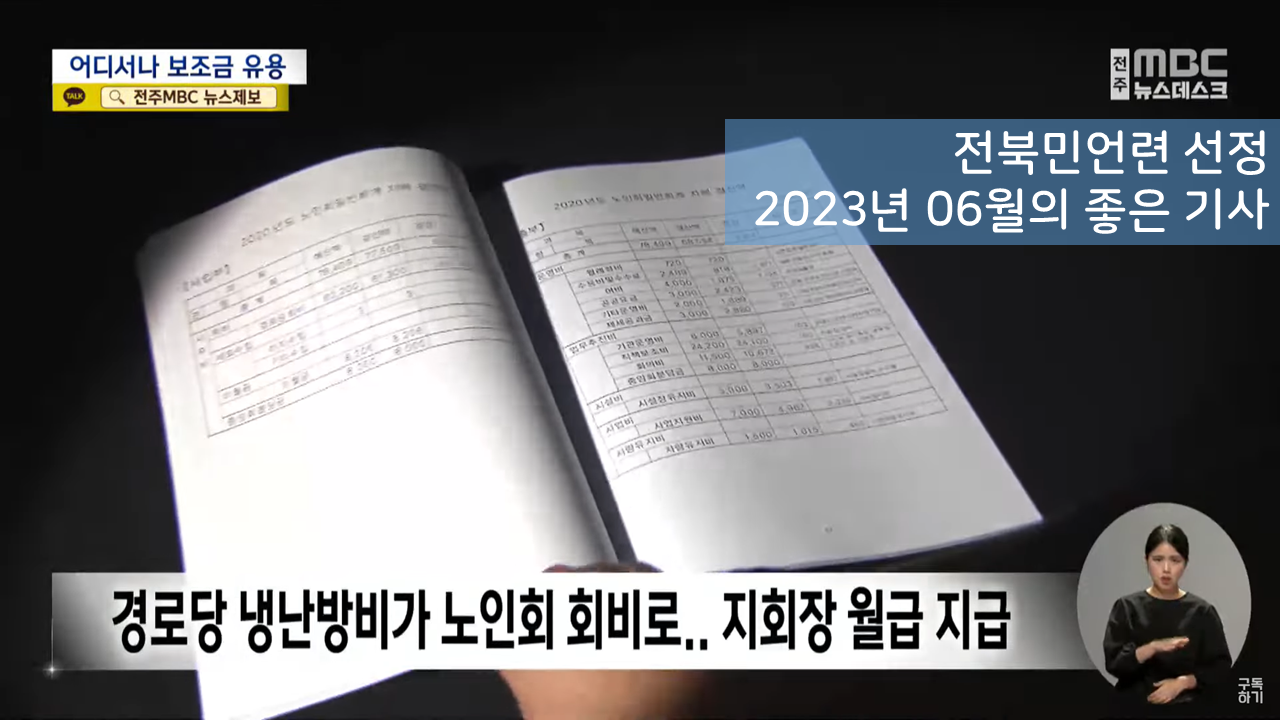 2023년 06월의 좋은 기사는 네 개의 후보 중 <경로당 보조금은 노인회장 월급? 노인회의 경로당 운영비 횡령 관행 비판> 전주MBC 보도가 67.9%의 투표를 받아 2023년 06월의 좋은 기사로 선정되었습니다. 축하드립니다.