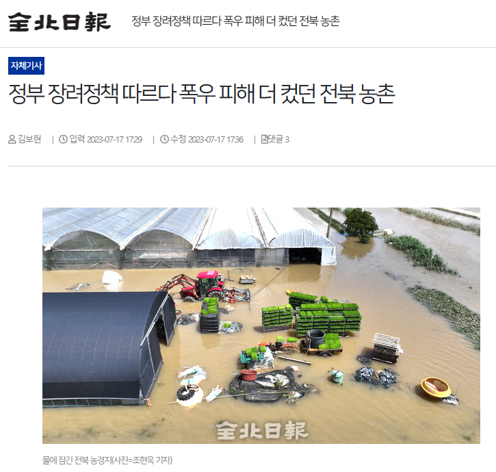 오늘 자 전북일보는 “논콩, 가루쌀 등 전략작물 피해가 많았기 때문이다. 침수 피해를 입은 도내 쌀 재배지는 9577헥타르, 논콩 재배지는 4533.7헥타르로 특히 논콩 주산지인 김제와 부안 등에 피해가 집중됐다.”라며 전북 지역의 농작물 피해가 큰 이유를 분석했는데요.