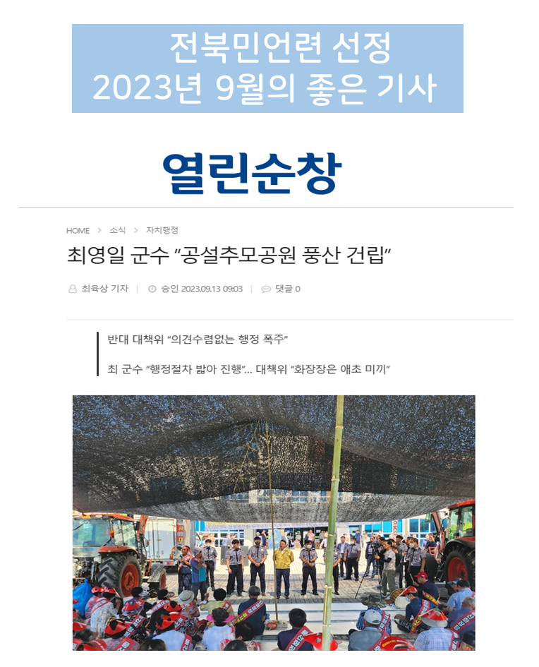 세 개의 후보 중 <순창군 공설추모공원, 화장장 건립 갈등 조명> 열린순창 보도가 86.3%의 투표를 받아 2023년 9월의 좋은 기사로 선정되었습니다. 축하드립니다.