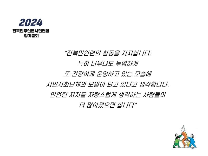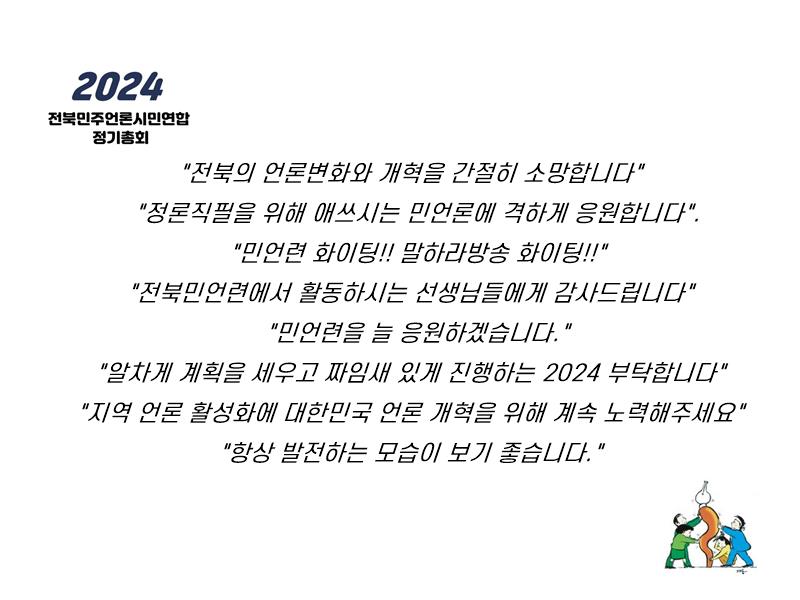 2024 정기총회도 사전에 자료집을 공개해 회원들에게 의견을 받았고, 온라인 위임을 하실 수 있도록 안내를 드렸습니다. 2023년부터 2월 16일 진행된 전북민언련 2024 정기총회 일정을 알리기 위해 <말하라> 소식지, 홈페이지, 문자, 웹소식지 등을 통해 안내도 해드렸고요. 2024년 1월 19일 총회준비위원회를 통해 사업 평가와 2024년 사업 계획을 잡고, 제12기 이사회 구성에 대한 논의도 진행했습니다.