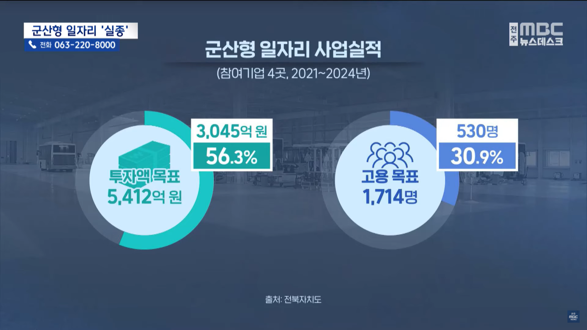 3일 전주MBC는 좀 더 비판적인 시각을 담아 보도했는데요, 10조 원대 경제효과가 기대된다는 전망은 어디로 갔냐고 지적했습니다. “중국산 차량 부품 수입과 조립으로 명맥만 잇고 있다. 군산형 일자리 사업의 부끄러운 현실”이라며, “전북자치도에 따르면 투자 액수는 목표 대비 절반을 넘겨 체면치레를 했지만 일자리는 530개로 목표치의 30%다. 전기차 위탁생산도 약 4,300대에 그쳐 목표 물량 32만여 대의 1%를 조금 넘겼다.”라고 보도했습니다.