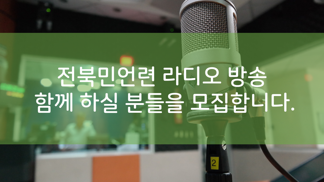 전북민언련은 시민들의 미디어 참여 기회를 늘리고, 기성 언론이 주목하지 않았던 목소리를 외부에 알리고자 전북민언련 후원 회원 및 시민들이 참여하는 라디오 방송을 준비하고 있습니다. 이에 라디오 제작을 함께 하실 분들을 모집합니다.