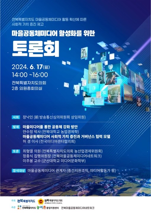 지방소멸 위기 속 마을공동체미디어 활동이 도시와 농촌의 공동체적 삶을 강화시키고, 지역의 새로운 동력이 될 것이라는 기대가 높아지고 있는 가운데, 도의회와의 협업을 통해 공동체 강화 방안 및 사회적 가치 증진 가능성을 모색하고자 전북마을공동체미디어네트워크와 함께 최형열 도의원 주최로 6월 17일 진행되었습니다.